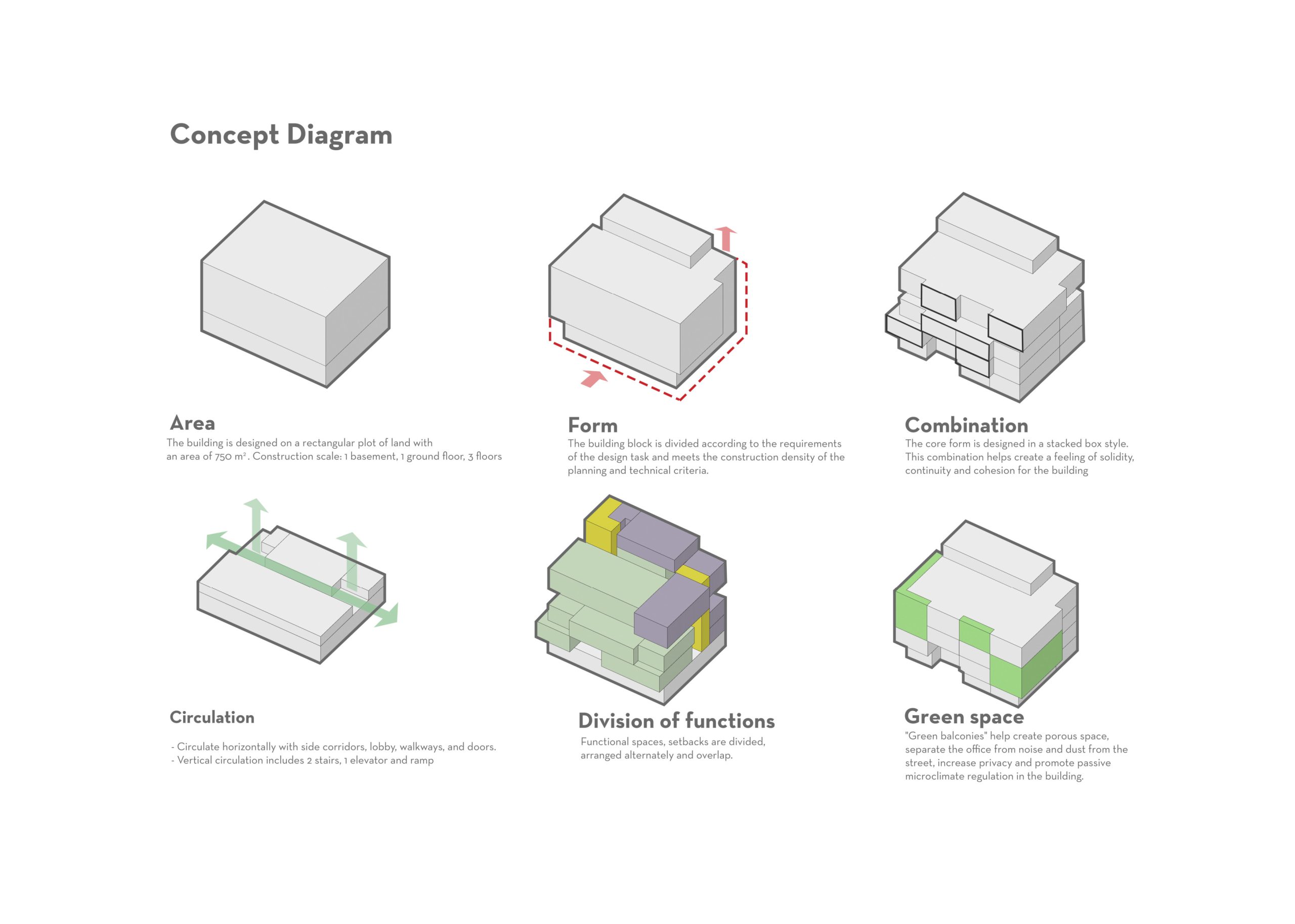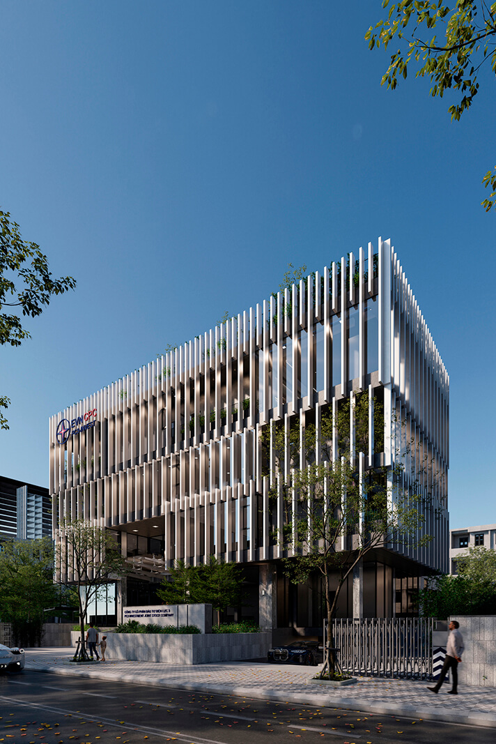 The office building features a modern, high-tech architectural style, highlighted by vertical louvers that create a strong and cohesive façade. The design helps control sunlight, reduce heat gain, and improve energy efficiency, while enhancing brand identity. Open spaces combined with greenery provide a professional, airy, and sustainable working environment.