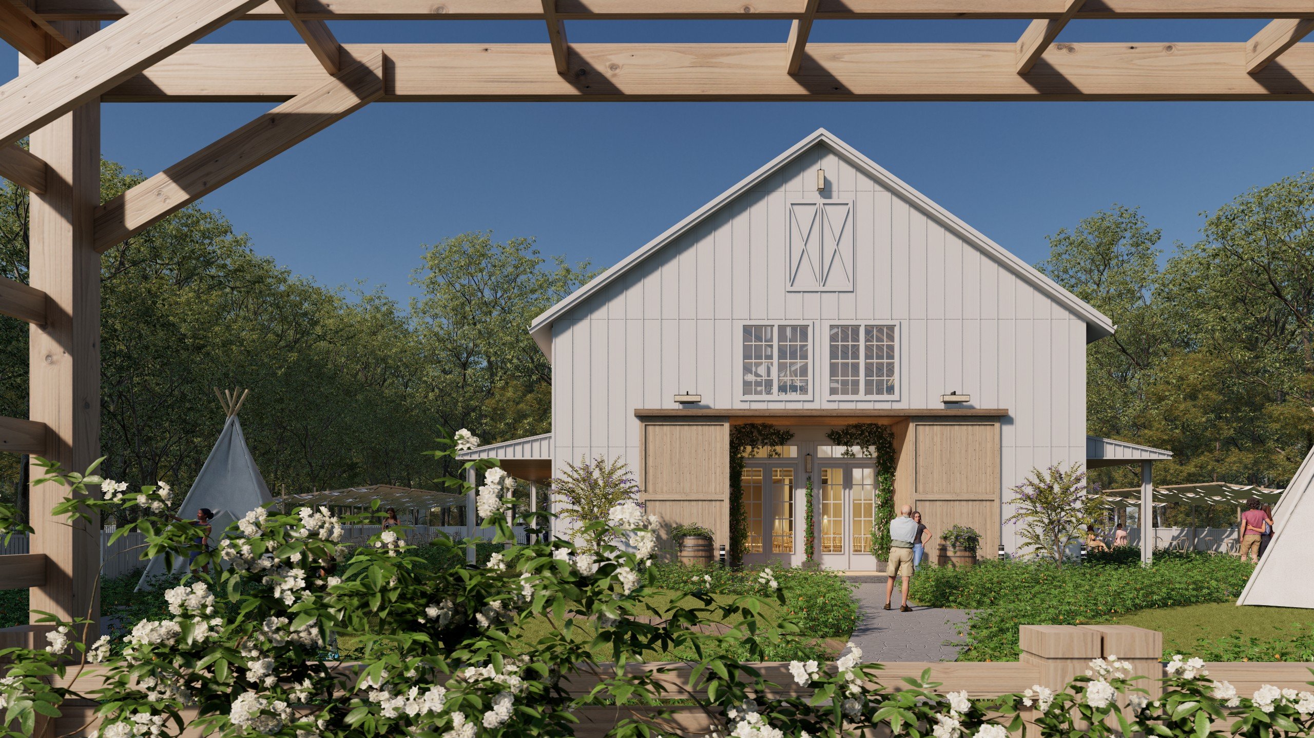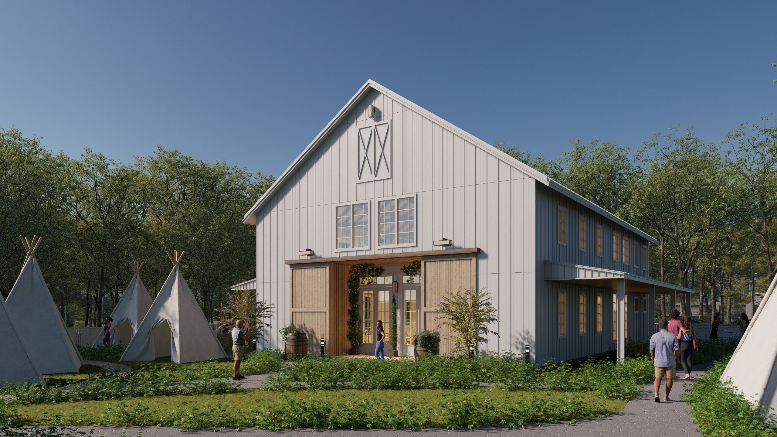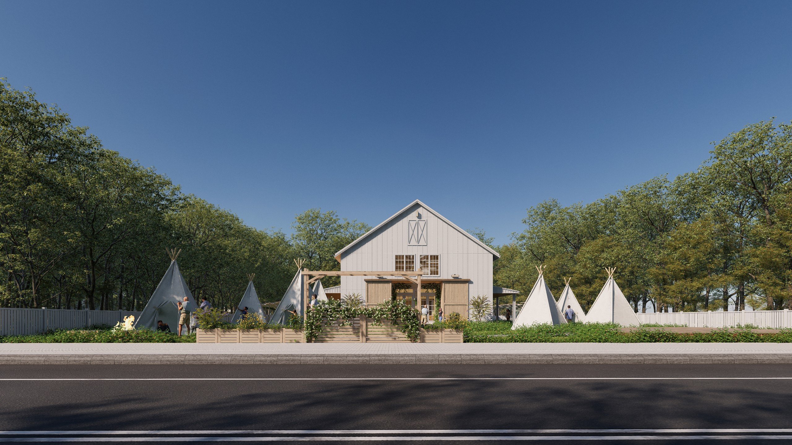 The glamping site is designed with a nature-oriented concept, featuring tents arranged within lush greenery and connected by gently curving pathways. The central building, inspired by a cozy wooden house, is combined with outdoor communal areas and activity spaces, creating a relaxing, immersive, and experience-driven retreat environment.