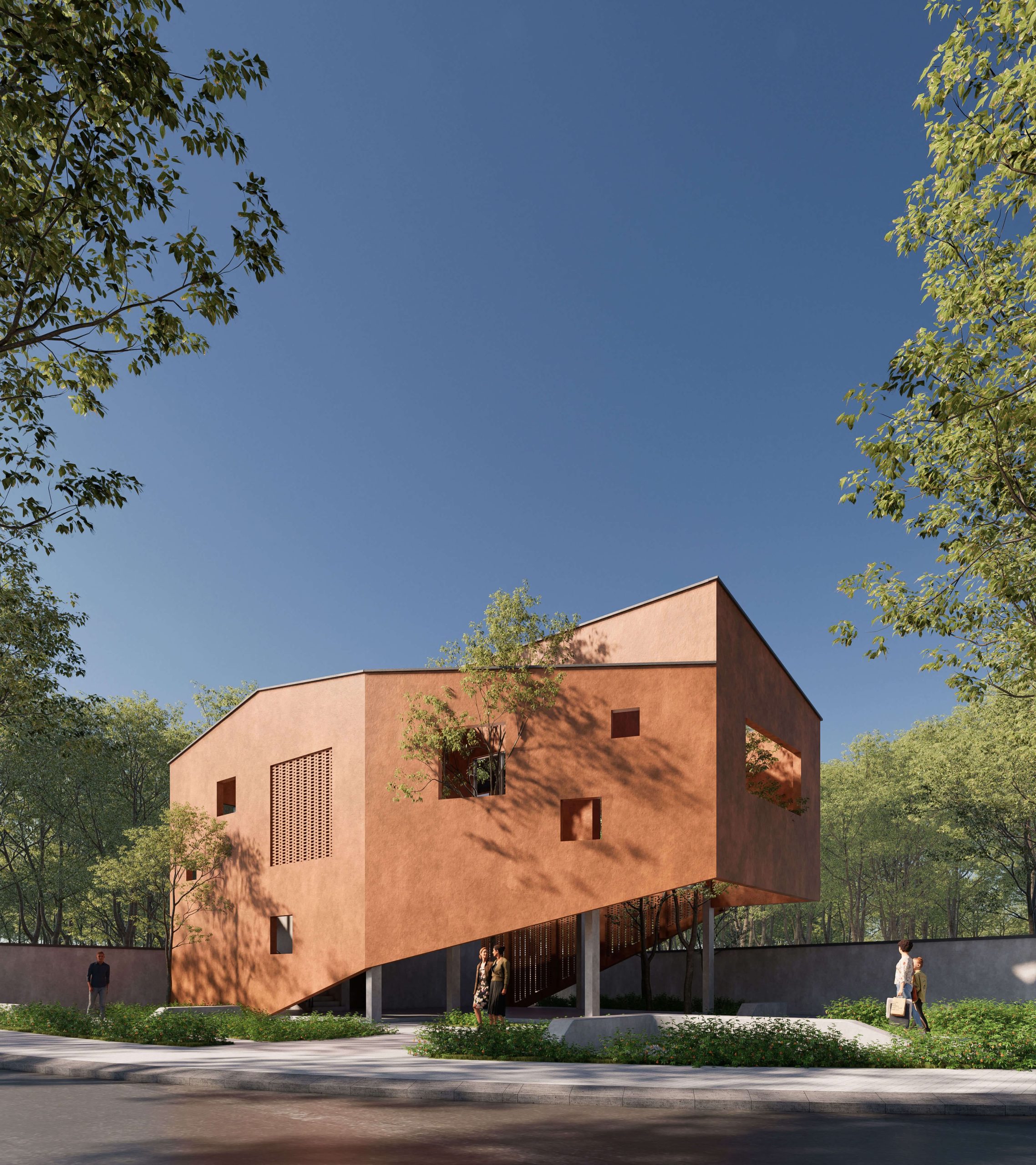 The community center features a modern, rustic architectural style, with simple volumes and warm earth-toned materials that create a welcoming atmosphere. The building is elevated on columns, forming an open ground level for communal activities and enhancing natural ventilation. Flexible window openings combined with greenery bring a friendly, airy space that connects harmoniously with nature.