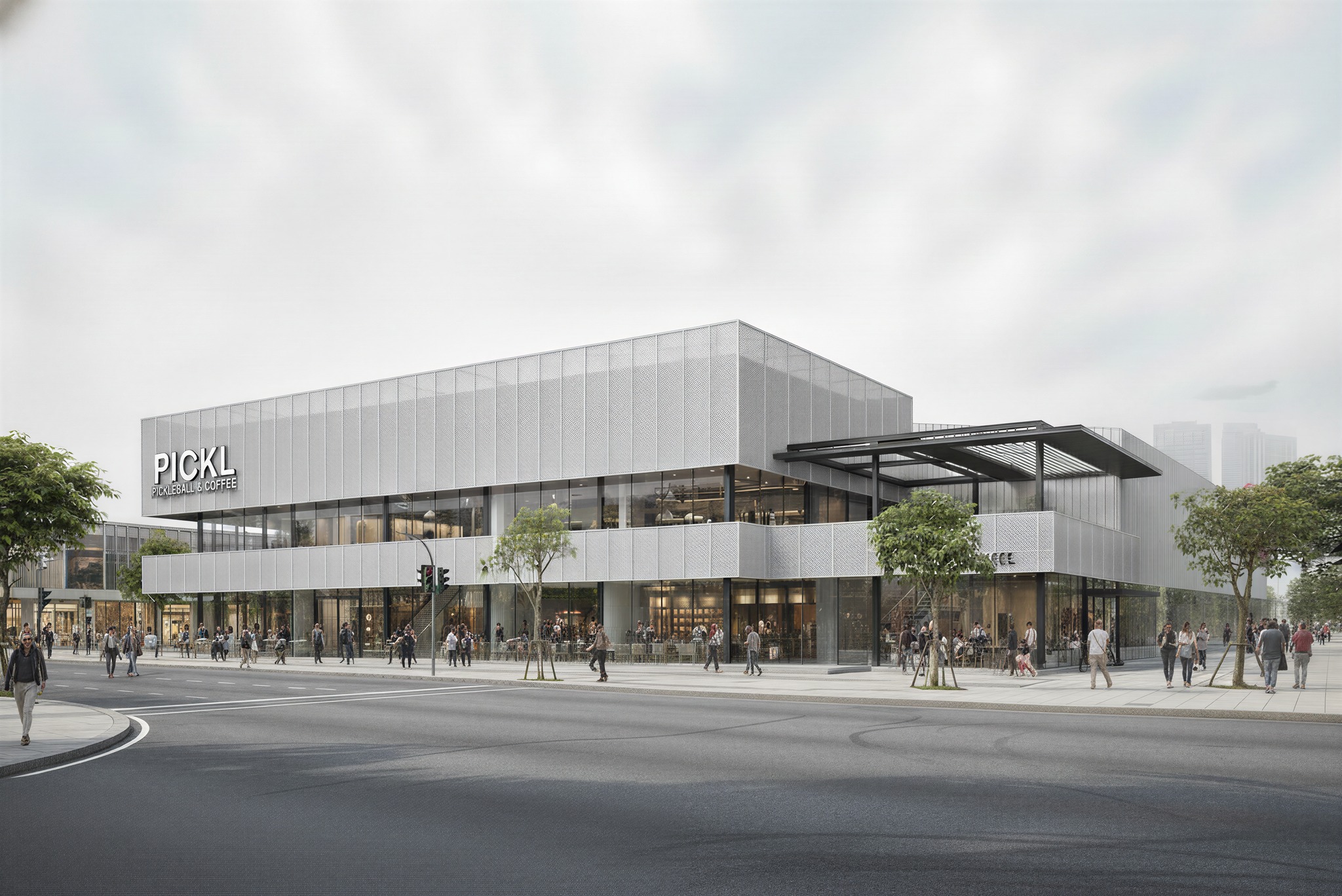 The Pickleball & Café building features a modern minimalist design, with clean, rectilinear volumes and a refined metal façade. Large glass panels create an open connection between indoor and outdoor spaces, supporting both sports activities and a relaxed café experience. The design emphasizes flexibility, making it a dynamic, youthful, and multifunctional destination.
