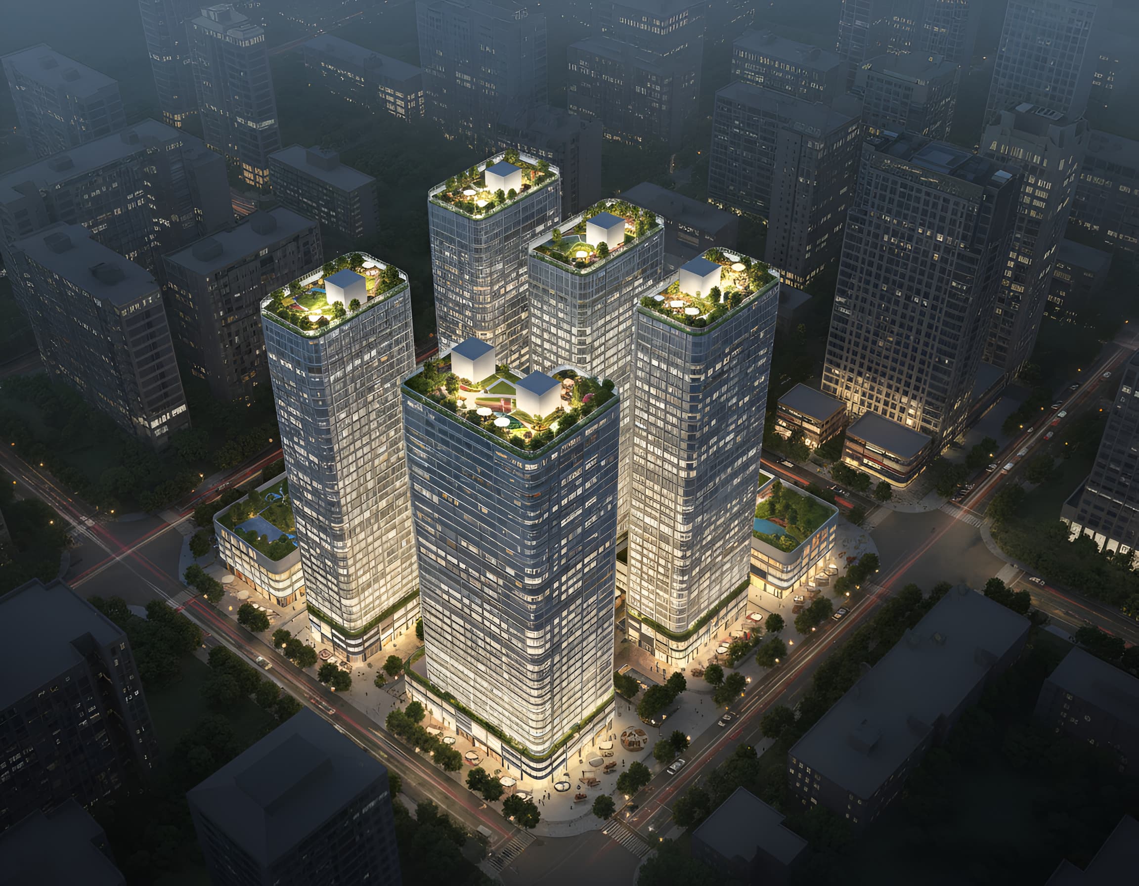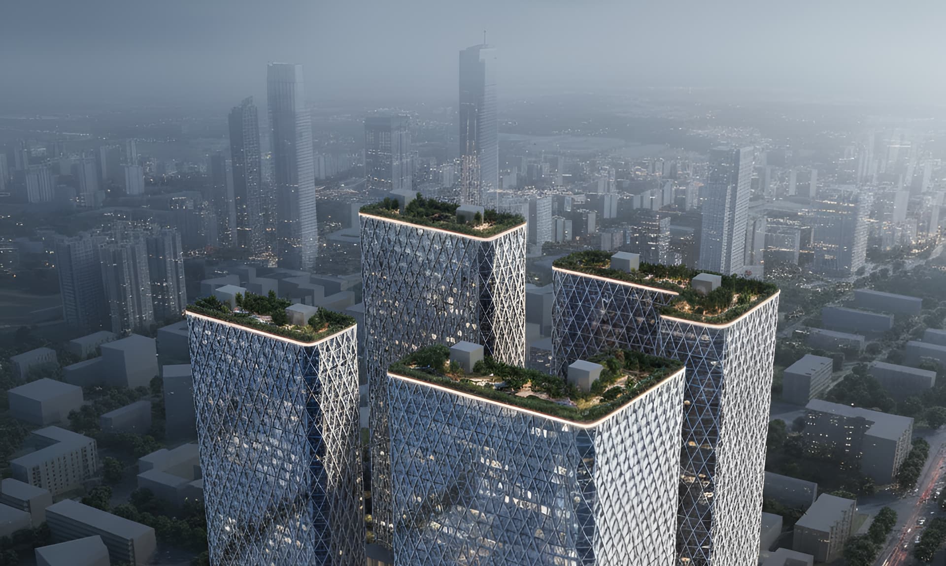 A symbol of modern and sustainable architecture, where two towers are connected in the sky and reflected on tranquil water. The design embodies harmony between humanity, nature, and technology.